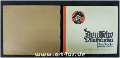 Sammelalbum "Deutsche Uniformen" Einband u. Originalschuber mit geringfügigen Alterungsspuren, Namenstempel im inneren Einband u. auf dem Vorsatz, Bilder komplett, schönes Exemplar; beiliegend einige Zeitungsausschnitte d. Z. zum Thema. H-02-21