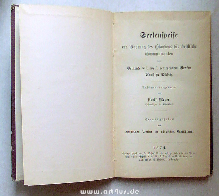 Seelenspeise zur Nahrung des Glaubens für christliche Communicanten von Heinrich XII., weil. Regierendem Grafen Reuß zu Schleiz. Aufs neue dargeboten von Adolf Meyer, Hofprediger in Obersdorf. Hrsg. vom christlichen Vereine im nördlichen Deutschland.